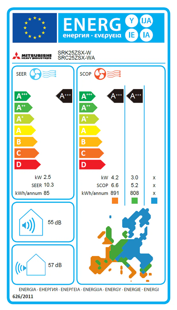 | Energiklasse A=(lavt forbrug) G=(Højt forbrug) Varme | A+++ |