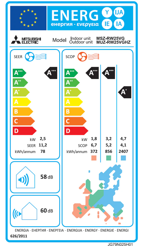 | Energiklasse A=(lavt forbrug) G=(Højt forbrug) Varme | A+++ |
