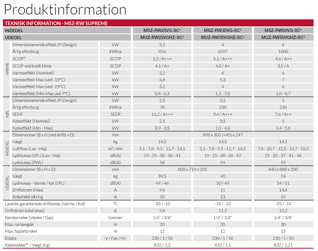 | Indendørsenhed | MUZ-RW25VGHZ-SC |